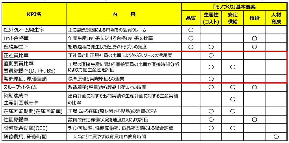 表1 工場の「モノづくり」のパフォーマンスレベルを評価するKPI例