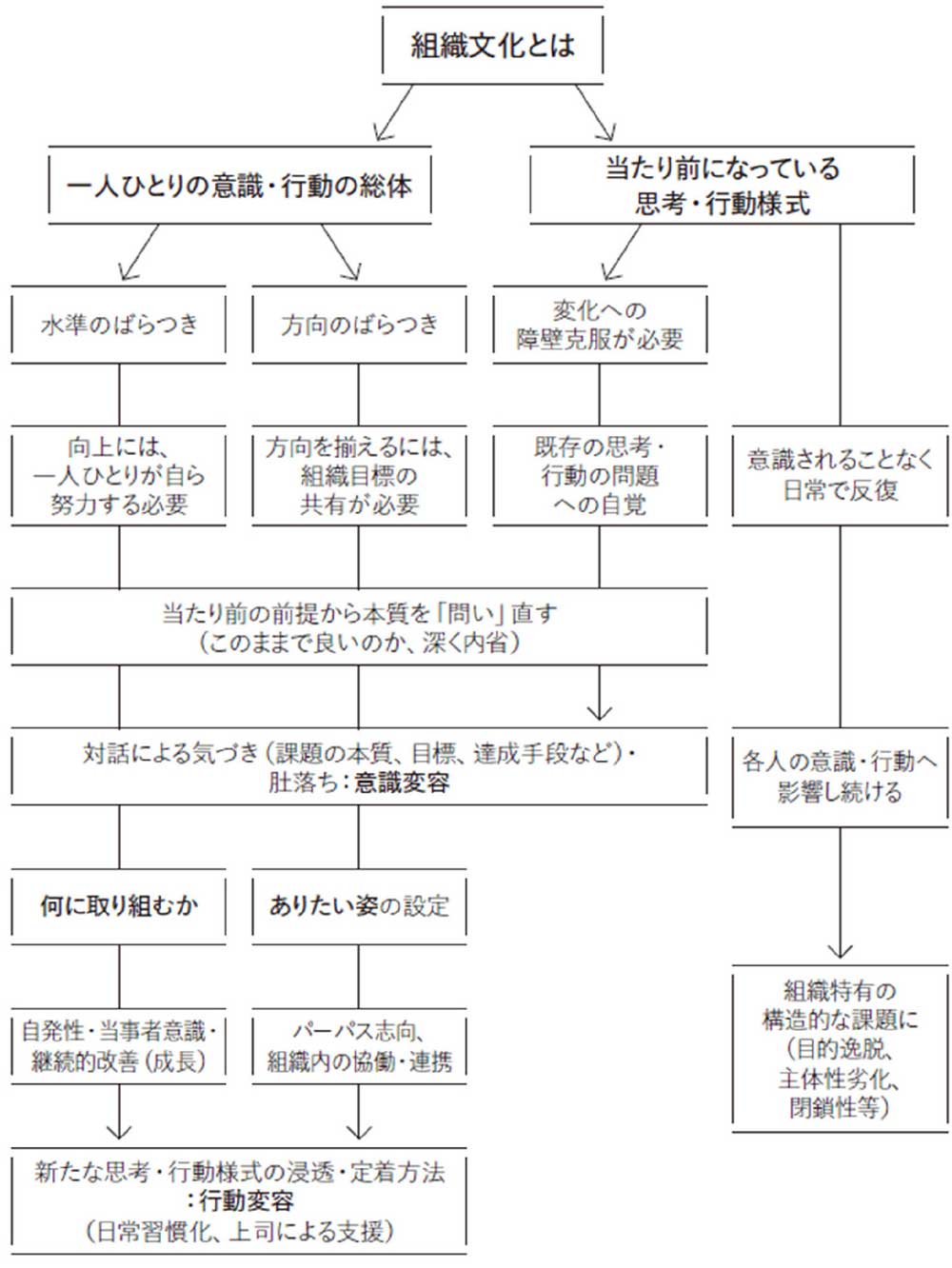 組織内で共通する考えや行動は、意識されずに日常反復され、習慣的に各人の意識や行動に影響し続けます。