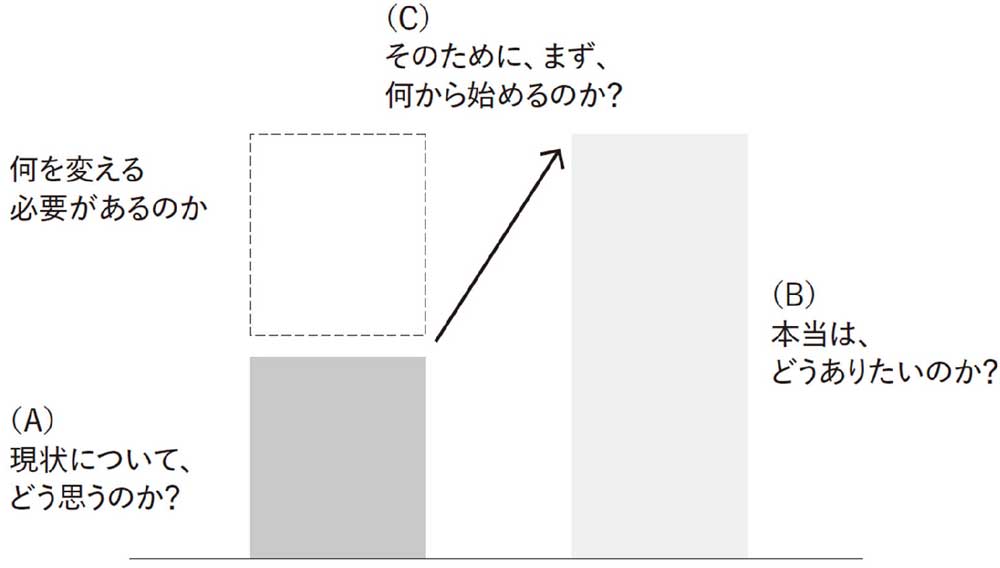 そこで、「このままで良いのだろうか」と、前提から問い直します。これは他者と「対話」することで、課題の本質や目的、達成手段についてハッとした「気づき」を得、「肚落ち」しやすくなります。