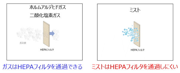 ガスはHEPAフィルタに捕集されず通過できるため、非常に有効な除染方法である。